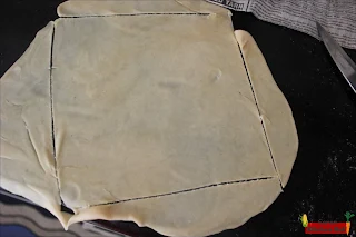 Now, Take a small piece of dough, and press like a thin roti, Cut the sides and make as square.
