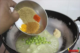 In a blender, Add 1 spoon of peas, Boiled peeled Potato and green chilli and grind well.